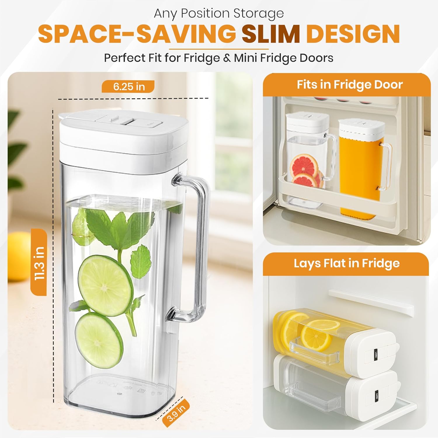 냉장고 친화적 인 상점은 똑바로 또는 평평한 평평한 평평한 :이 우주 절약 음료 투수는 냉장고 문에 쉽게 맞습니다 (미니 냉장고조차도 나란히 투수 2 개를 수용 할 수 있음)이 누출되지 않고 선반에 평평하게 놓여있어 뚜껑이 달린 완벽한 플라스틱 워터 투수가 컴팩트 자탁기와 공간을 극대화합니다. “