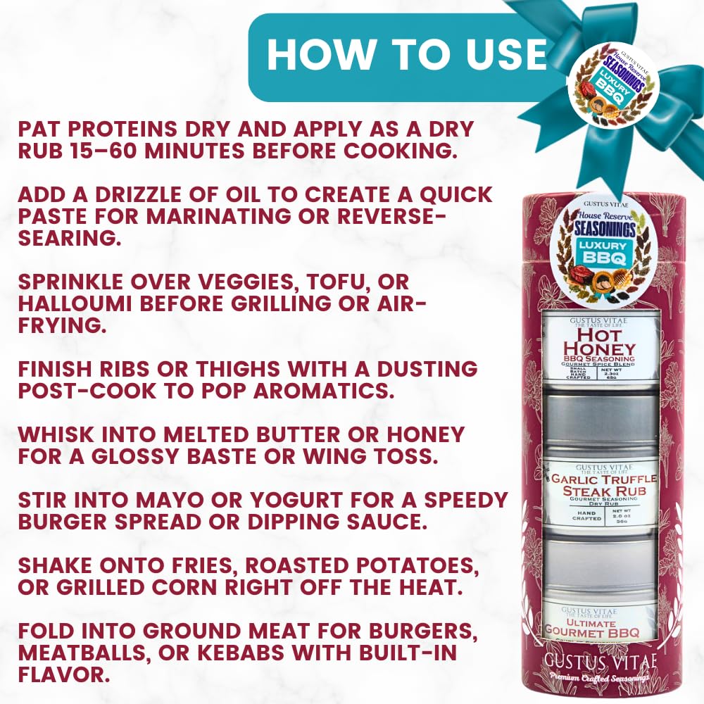 주중 밤과 주말에도 스테이크의 위엄과 훈제장의 깊이를 느껴보세요. 럭셔리 바비큐 하우스 리저브 시즈닝 선물 팩은 바비큐를 하든, 훈제 작업을 하든, 실내에서 그릴을 굽든 상관없이 간단하고 멋진 결과를 위해 만들어진 작은 배치의 수제 타이어 3개입니다. 맛 감정가와 훈련 중인 피트 마스터를 위해 제작된 이 다용도 블렌드는 전문가 수준의 크러스트, 맛있는 향 및 균형 잡히고 반복 가능한 맛을 단 몇 초 만에 제공합니다.