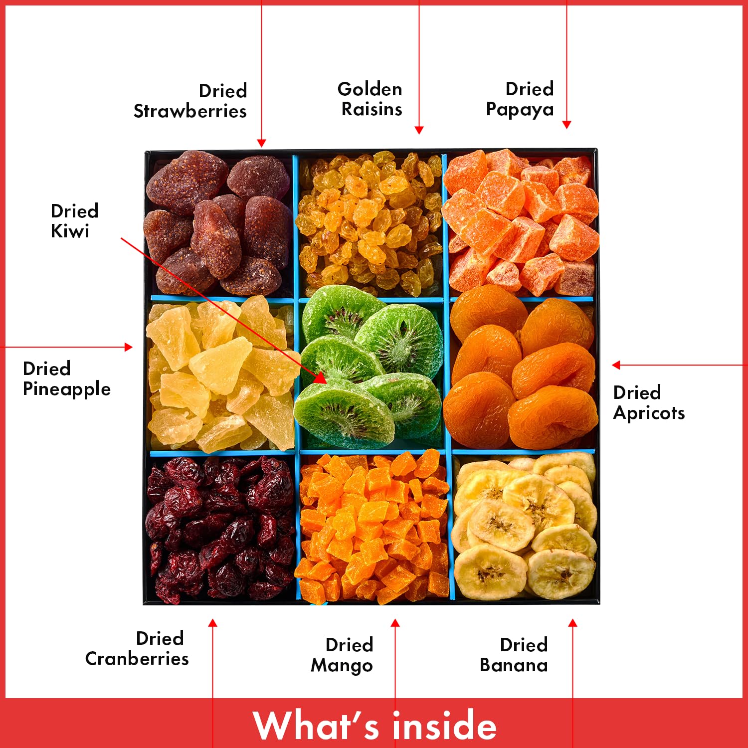포함 : 터키 살구, 딸기, 키위, 망고, 파파야, 파인애플, 바나나, 크랜베리, 골든 캘리포니아 건포도.