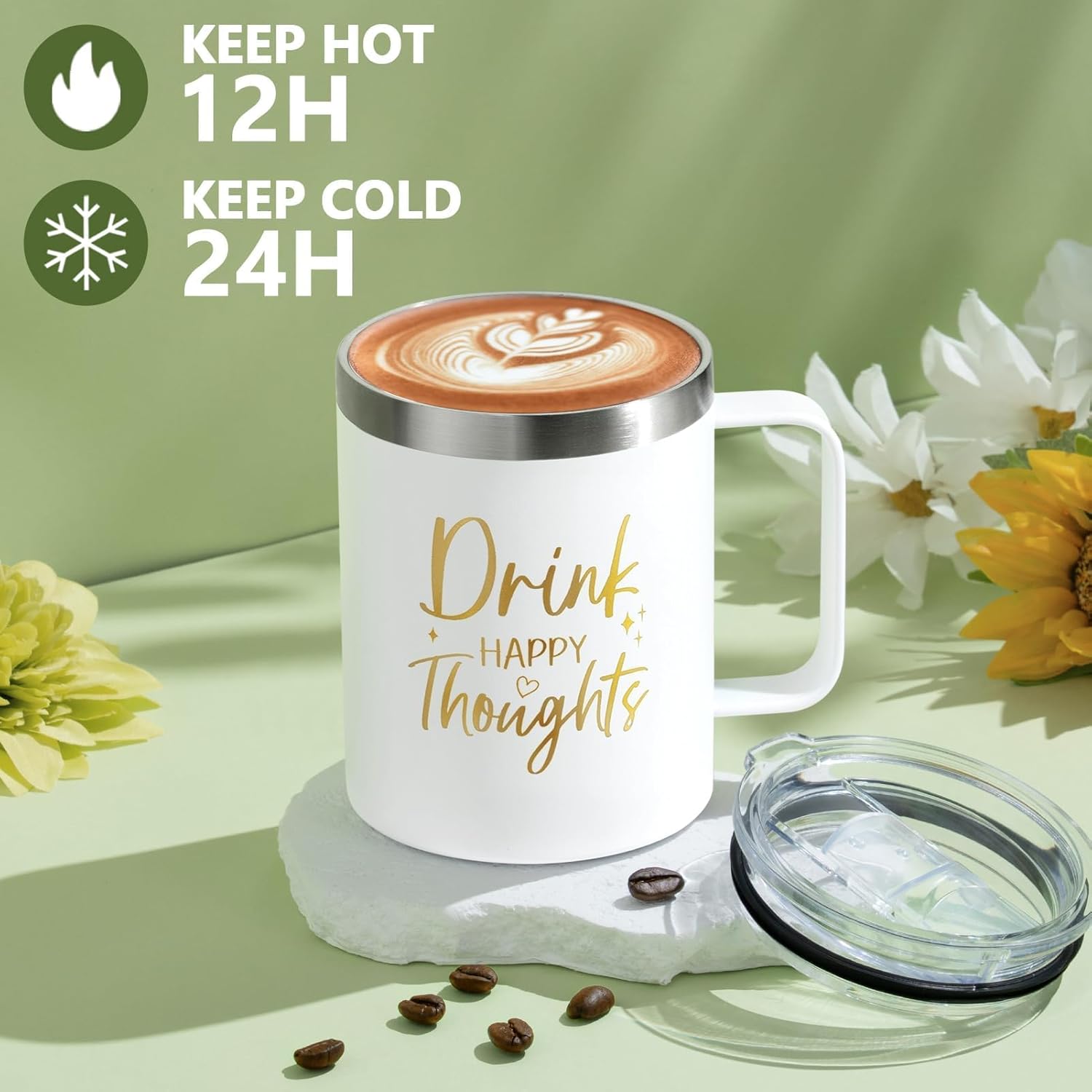 손잡이가 있는 단열 텀블러: 여성을 위한 셀프 케어 선물 가장 친한 친구 생일 선물로 12온스 단열 텀블러로 사랑과 보살핌을 보여주세요. 이중벽 진공 단열재가 있는 18/8 스테인리스 스틸로 만들어져 음료를 9시간 동안 차갑게 유지하거나 3시간 동안 뜨겁게 유지합니다. 아이스 커피, 차, 와인, 주스, 샴페인 등에 적합합니다. 진심이 담긴 “행복한 생각을 마시세요” 메시지는 소중한 사람에게 의미 있는 제스처가 됩니다. 여성을 위한 동기 부여 격려 해바라기 선물로 이상적입니다.