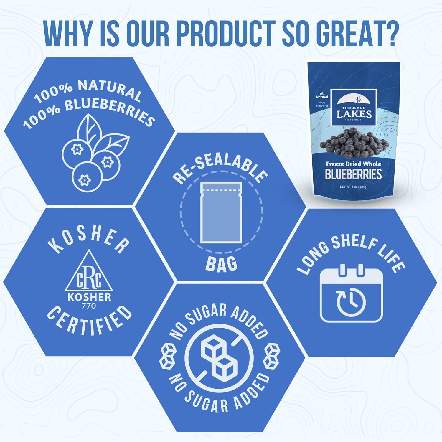 2 개의 다시 밀봉 가능한 파우치, 각각 1.2 온스, 총 2.4 oz의 동결 건조 된 블루 베리.