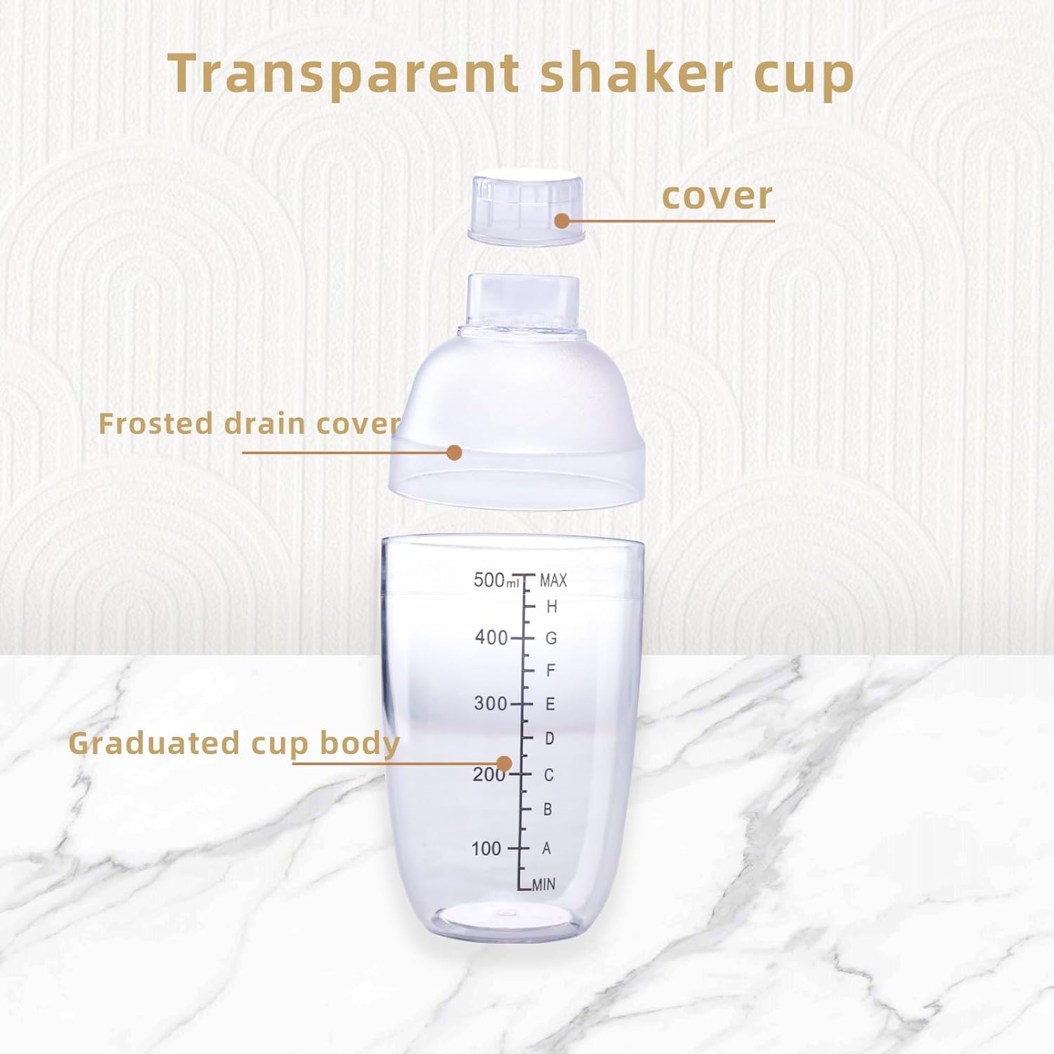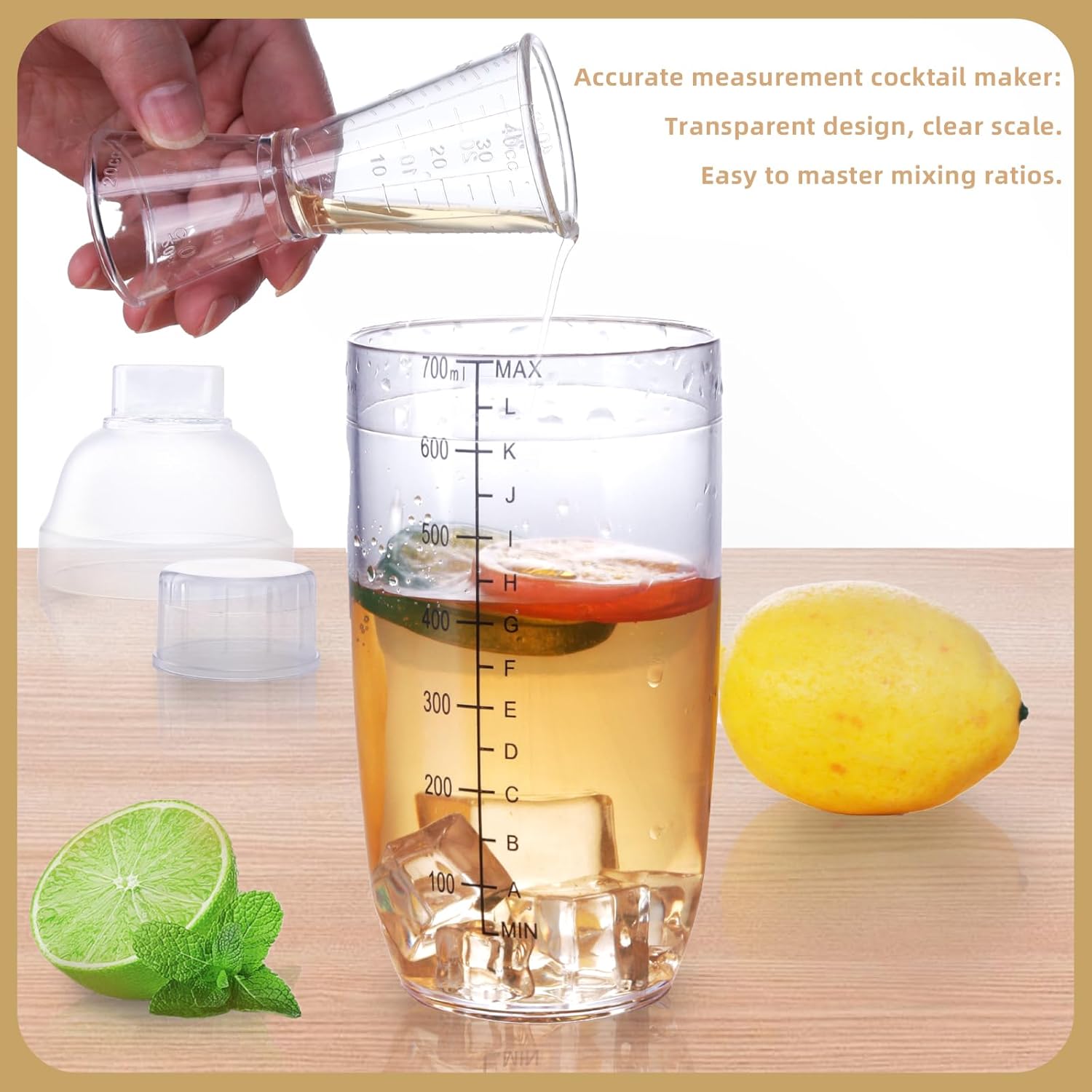 정확한 스케일 식별 : 명확한 용량 척도 (예 : ML/OZ)는 컵 외부 또는 내부에 인쇄되므로 특히 엄격한 공식이 필요한 칵테일, 커피 또는 베이킹에 적합한 액체 비율을 쉽게 제어 할 수 있습니다.