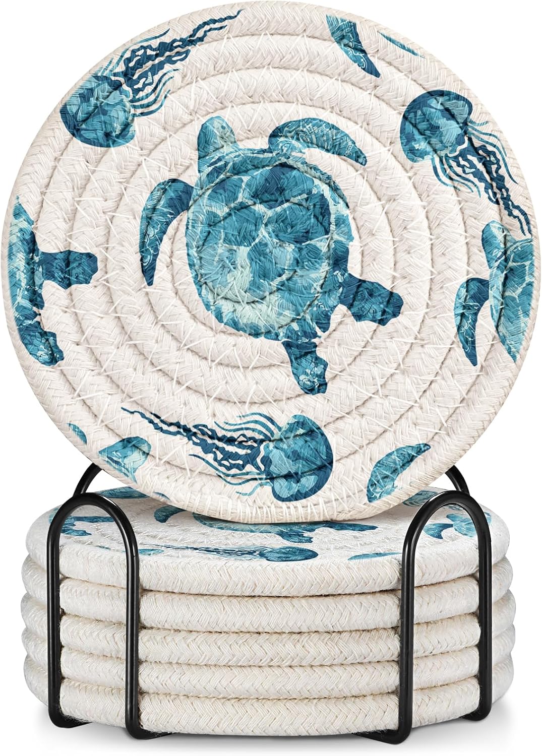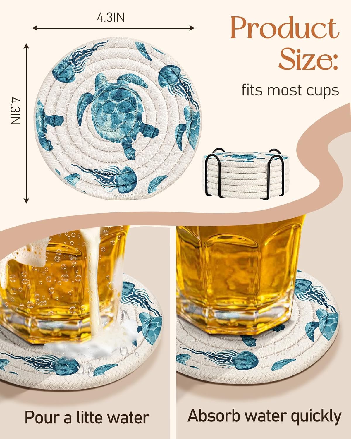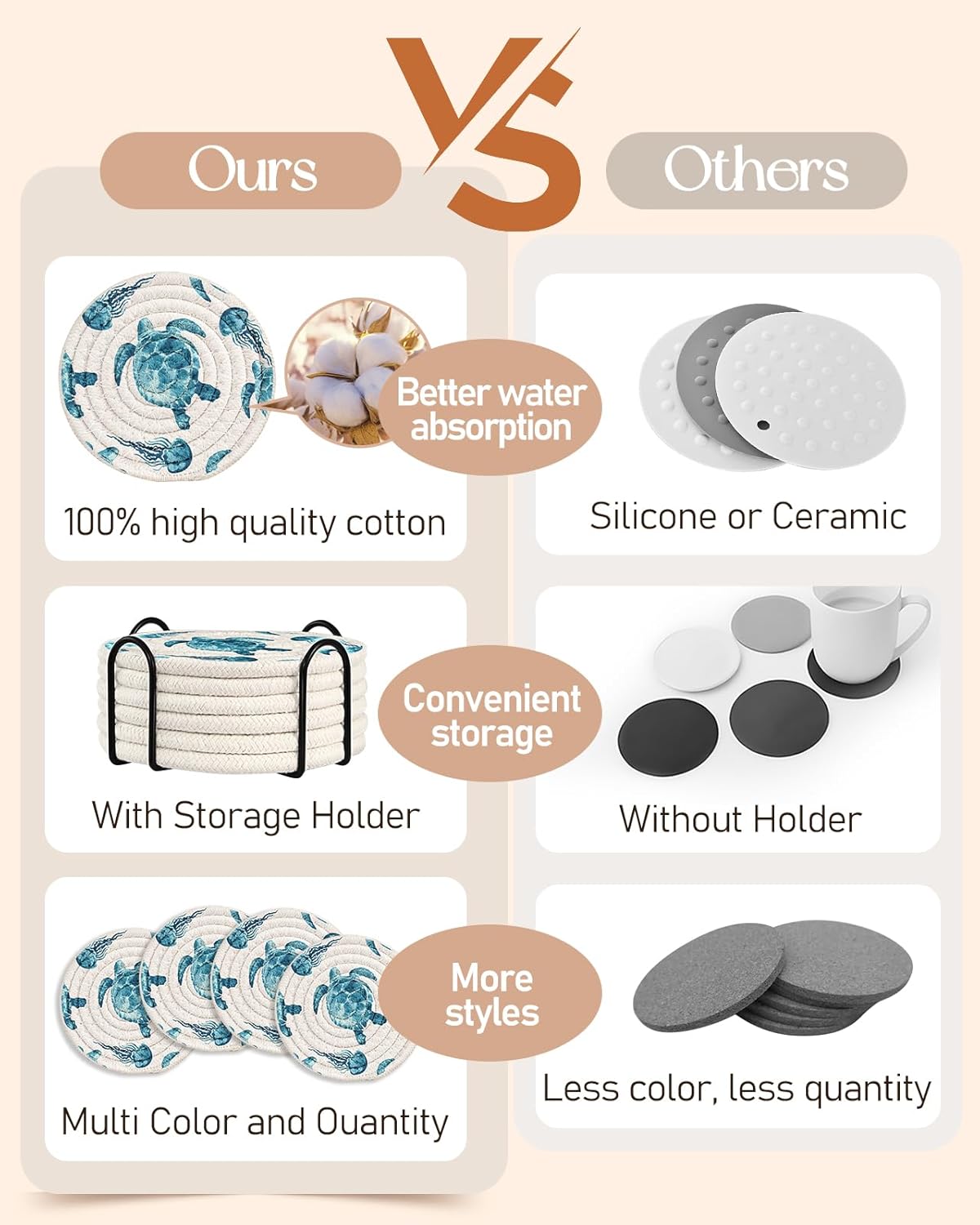 100% 면화 및 리넨 핸드 케이프 맨 정신 : 100% 순수한면과 리넨을 사용하여 최대한주의를 기울인 커피 테이블 용이 코스터는 독특하고 수제 터치를 제공합니다. 실리콘 또는 세라믹 코스터와 비교하여 우수한 흡수성을 나타내어 탁자가 건조하고 보호됩니다.