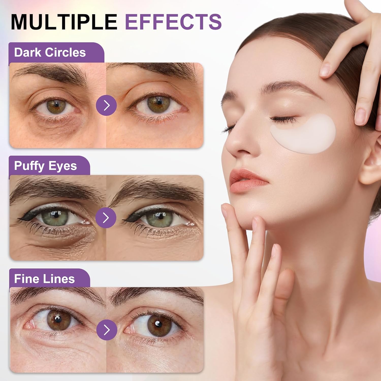 6 개의 주요 성분을 갖춘 고급 공식 – 눈 패치 아래의 하이드로 겔에는 콜라겐, 펩티드, 니아신 아미드, 카페인, 히알루 론산 및 해초 추출물의 강력한 혼합이 주입됩니다. 이 성분들은 함께 작동하여 섬세한 눈 영역을 깊이 수분을 공급하고 확고하게하고 활성화합니다.