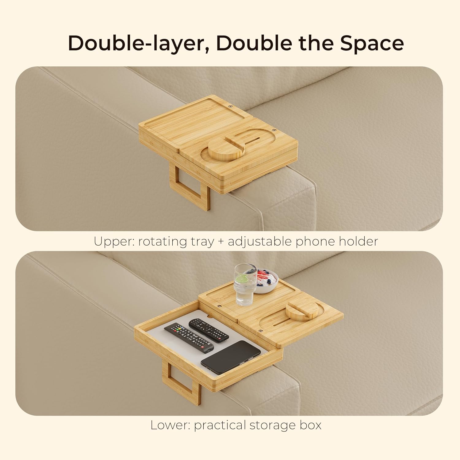 이중 회전 디자인 : 세련된 대나무 소파 팔걸이 테이블로 거실을 업그레이드하십시오! 리모컨 및 충전기와 같은 작은 품목을위한 숨겨진 스토리지 상자가 모두 슬림 한 1 인치 디자인 내에 있습니다. 이 테이블에는 2 개의 180 ° 회전 뚜껑이 있습니다. 하나는 360 ° 전화 홀더가 있고 다른 하나는 간식과 음료를위한 편리한 트레이입니다. 이 스마트 디자인을 사용하면 항목에 쉽게 액세스하고 공간을 절약 할 수 있습니다. 필요한 모든 것을 손가락 끝으로 유지하기에 좋습니다. 오늘날 공간을보다 효율적이고 편안하게 만드십시오!