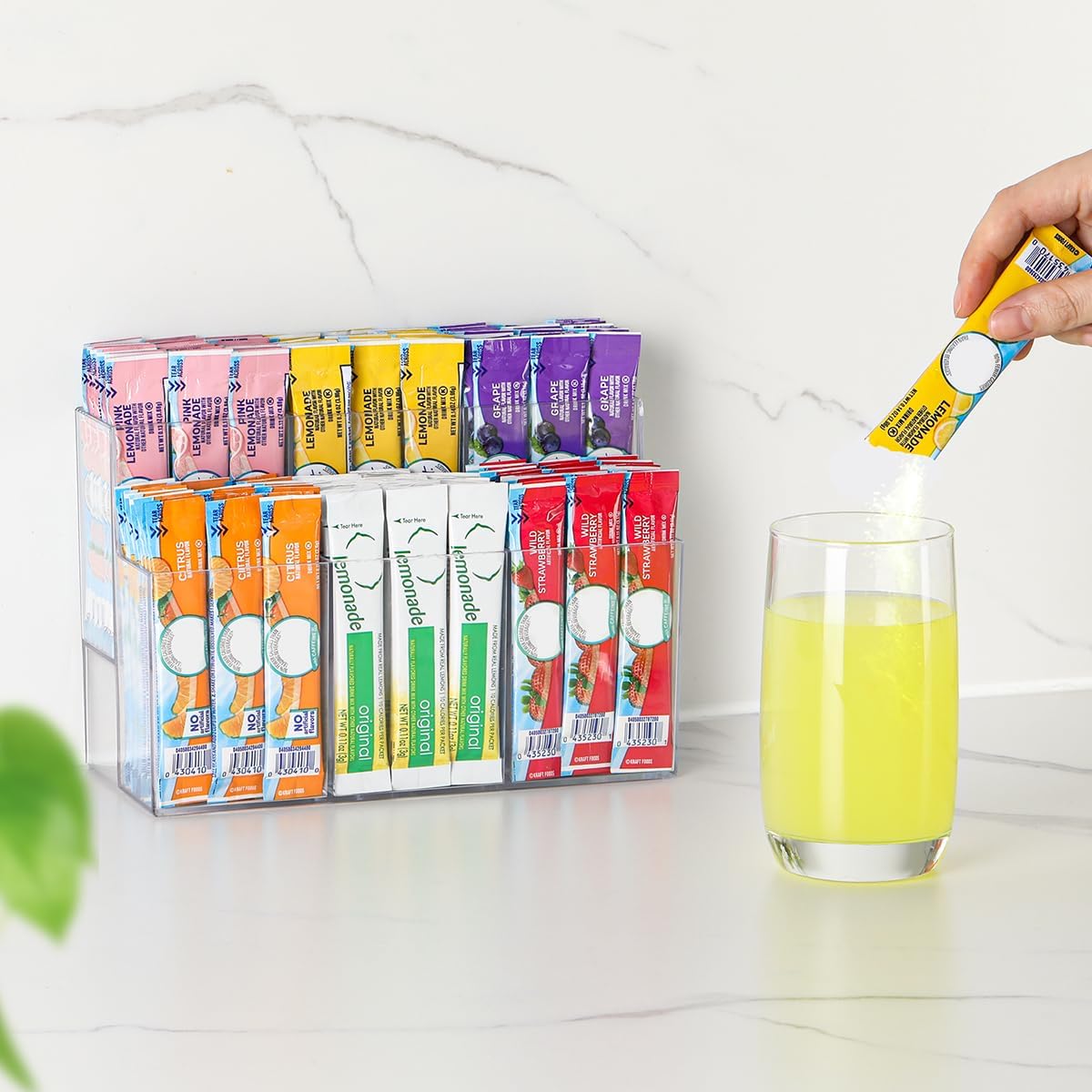깔끔한 보관 : 더 이상 지저분한 상자와 흩어진 패킷이 없습니다! 음료 패킷 주최자는 식품 저장실, 캐비닛 또는 주방 테이블 조리대에 물 향료 팩, 전해질 믹스, 단백질 막대를 저장하는 데 좋습니다.
