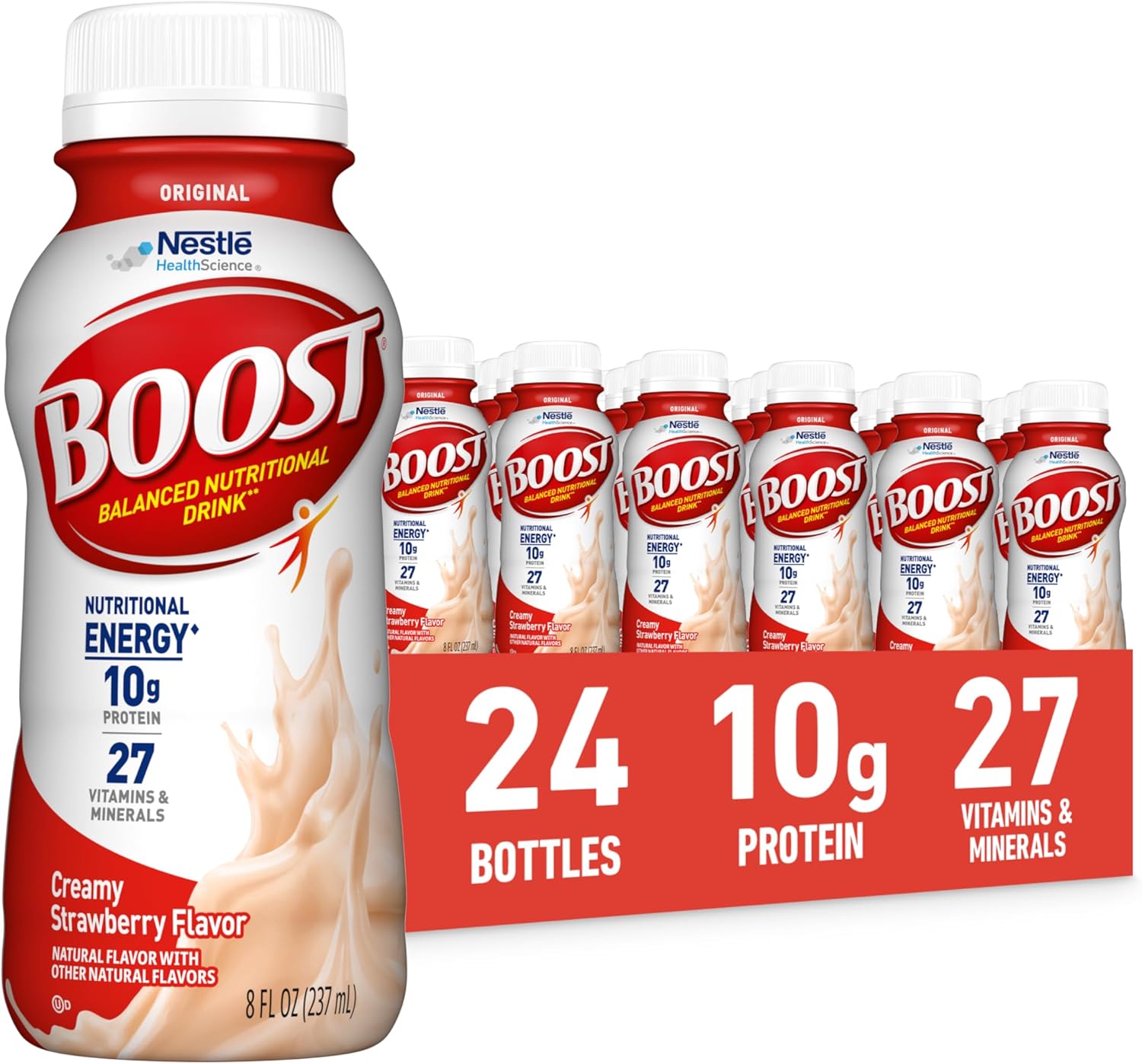 BOOST 오리지널 크리미 딸기 맛의 주요 이점 균형 잡힌 영양 8액량 온스 음료: 240칼로리 – 어떤 일이든 활력을 되찾는 데 도움이 됩니다. 10g 고품질 단백질 – 근육 유지에 도움이 되며, 27가지 비타민 및 미네랄 – 매일 필요한 영양 – 칼슘 및 비타민 D – 튼튼한 뼈를 유지하는 데 도움이 됩니다.