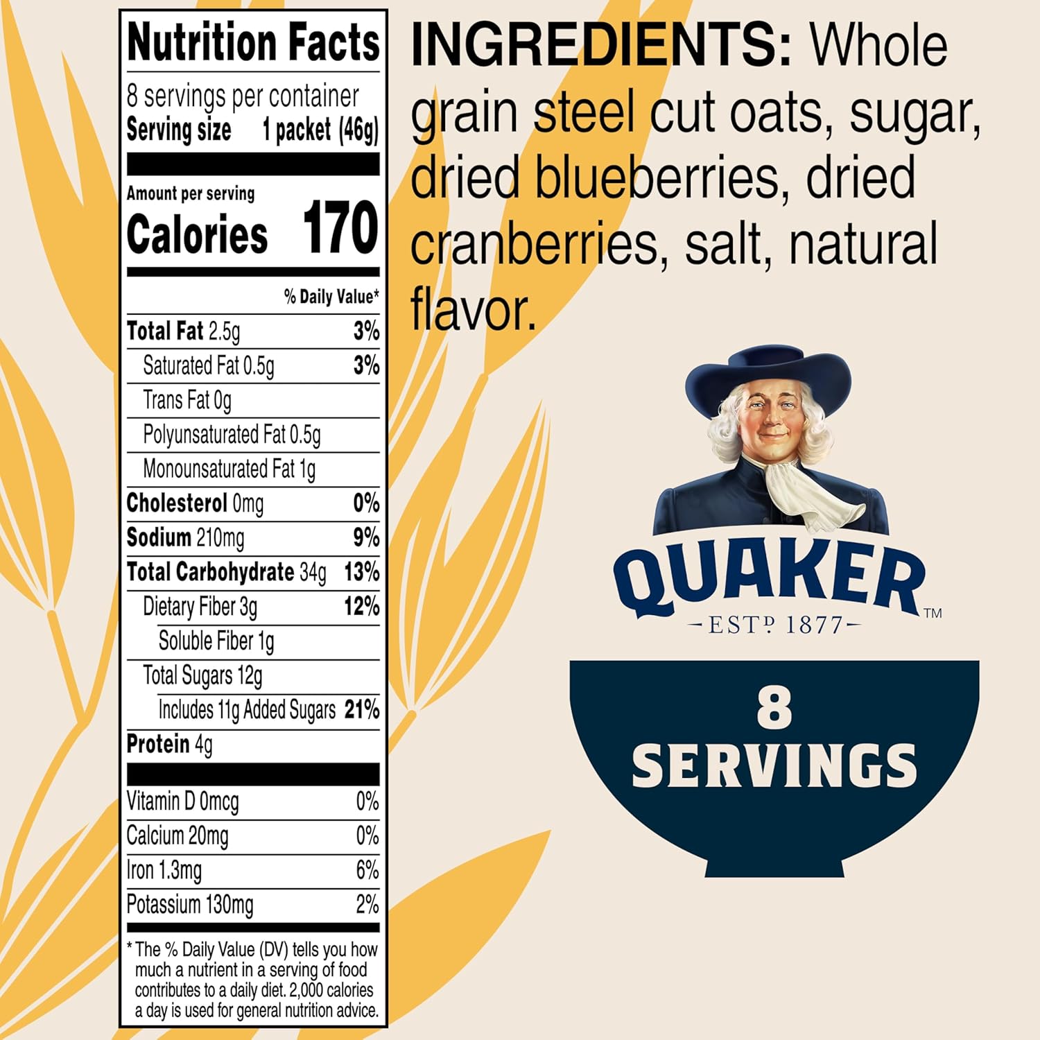 퀘이커 스틸 컷 인스턴트 오트밀, 블루베리 크랜베리 아침 시리얼, 심장 건강 오트밀 1.62온스 패키지 8개 포함