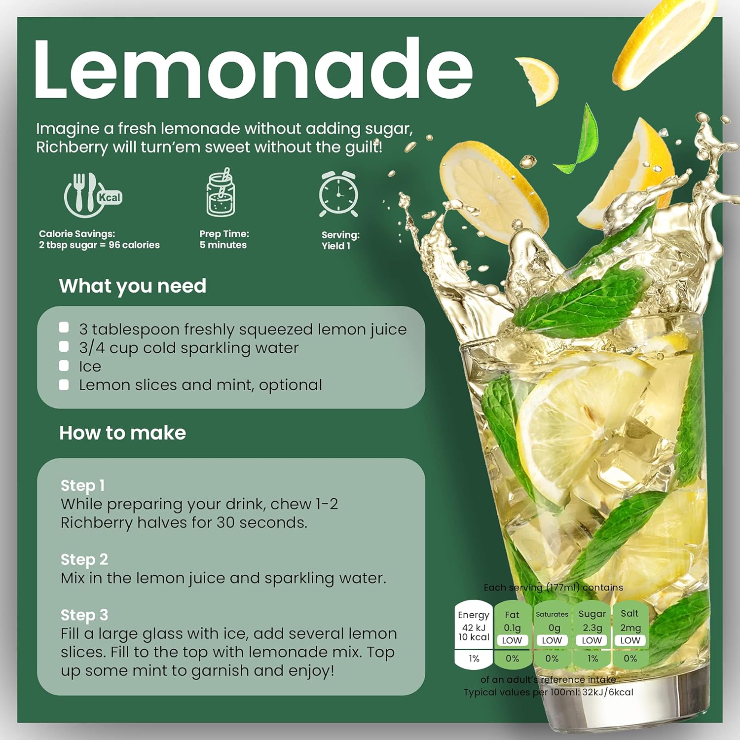 자연스럽게 신맛이 나는 음식을 달콤하게합니다 – 당신의 입맛을 과급하십시오! 레몬, 라임, 딸기, 자몽 등과 같은 신맛이 나는 음식을 설탕을 넣지 않고 달콤한 맛을 맛볼 수 있습니다. Richberry와 함께 다음 레모네이드를 사용해보십시오.