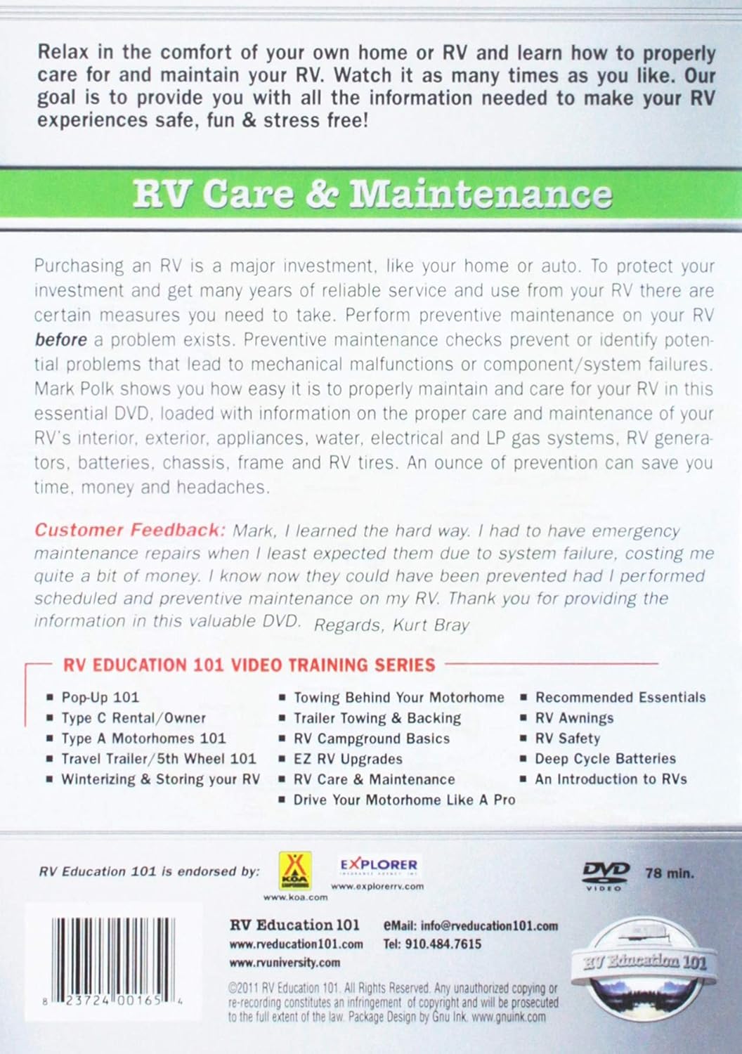 예방 유지보수는 문제가 발생하기 전에 RV에 수행되는 유지보수입니다. 예방적 유지 관리 점검은 RV의 구성 요소나 시스템의 기계적 고장, 오작동 또는 고장으로 이어질 수 있는 잠재적인 문제를 예방하거나 식별하도록 설계되었습니다. RV 관리 및 유지 관리 DVD는 RV 내부, RV 외부, RV 기기, LP 가스 시스템, 물 시스템, 전기 시스템, RV 발전기, RV 배터리, 섀시 및 프레임, RV 타이어에 대한 적절한 관리 및 유지 관리에 대한 정보를 다룹니다. RV 전문가 Mark Polk가 RV 관리 방법을 철저하게 이해하도록 도와드립니다. 필요한 만큼 여러 번 시청하세요.