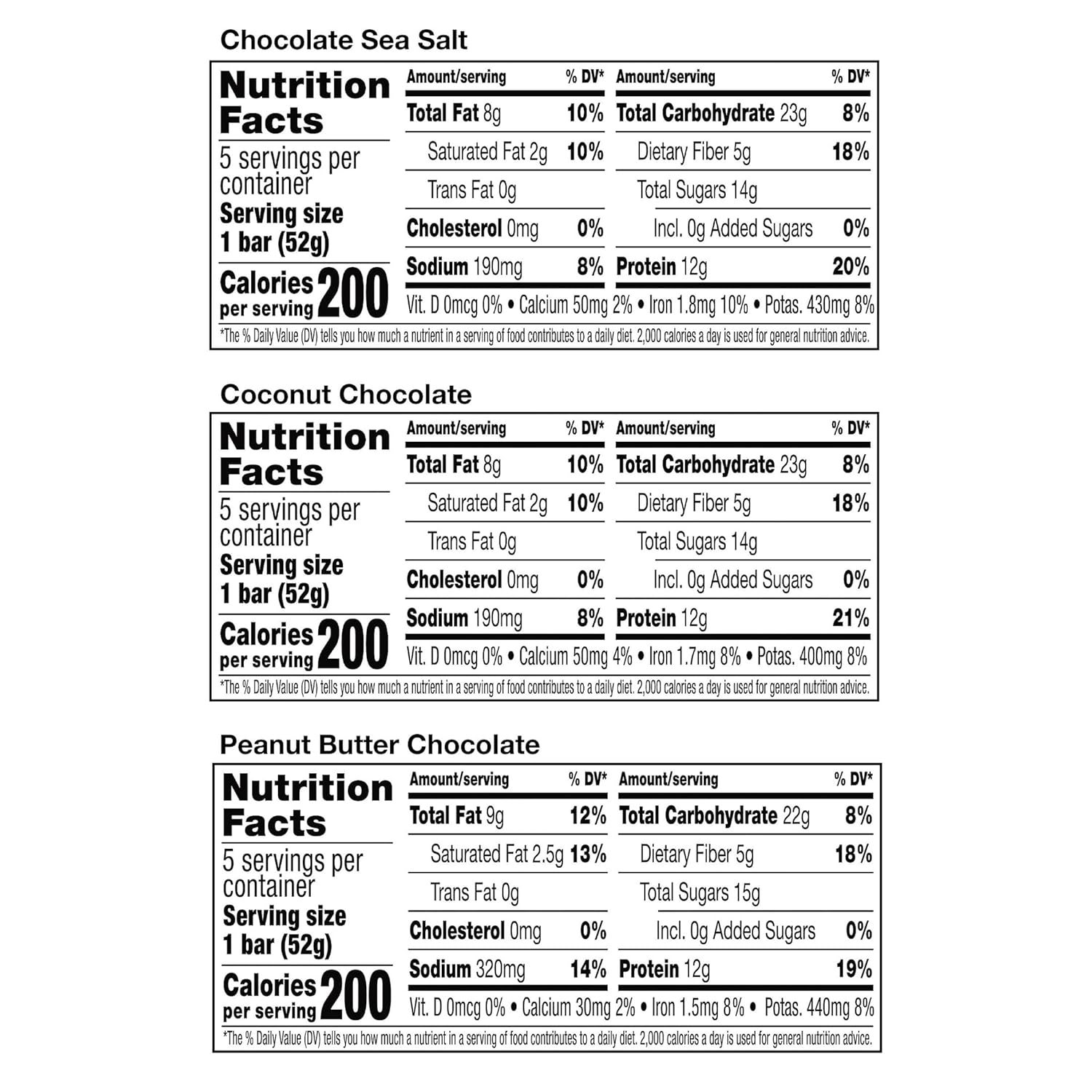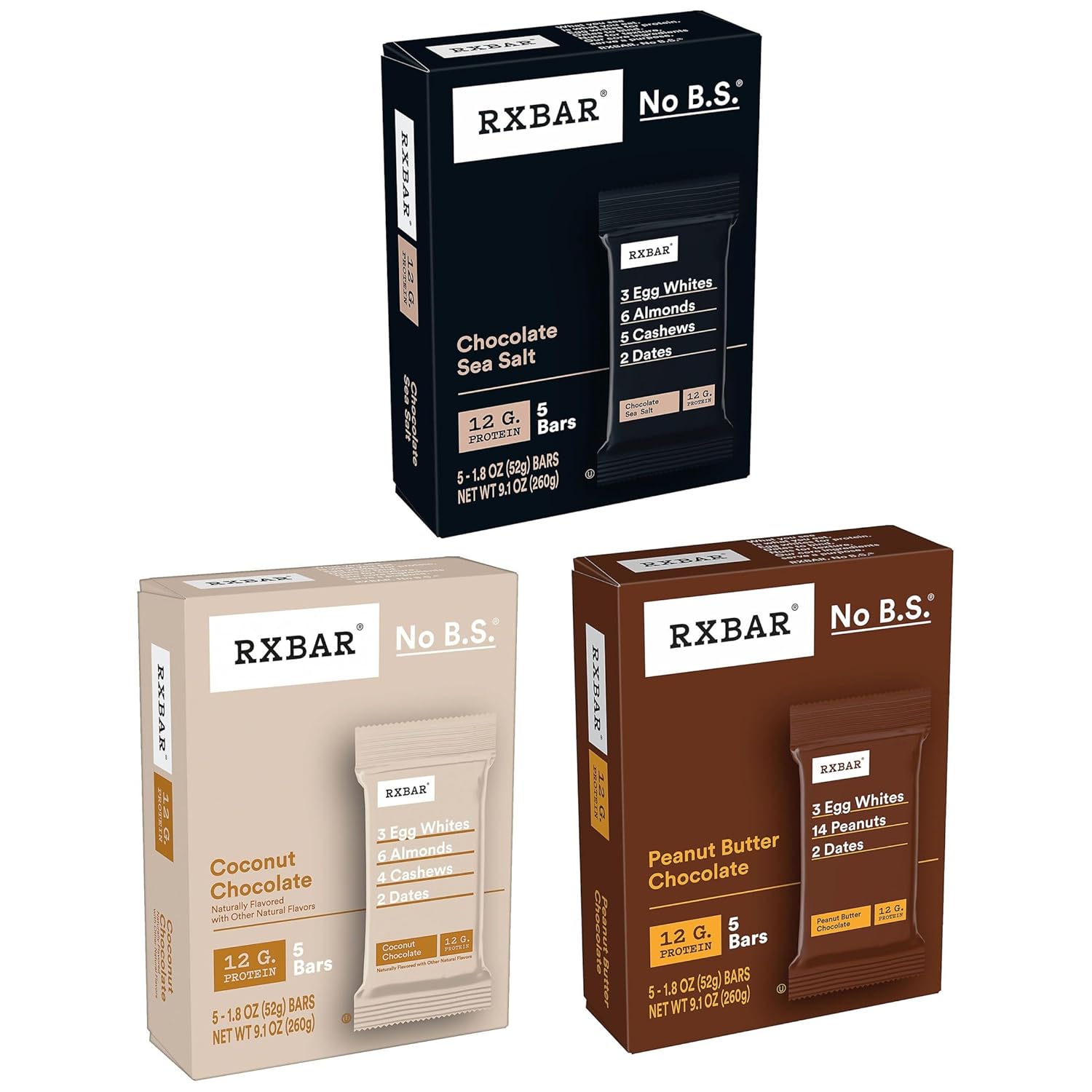 5 개의 rxbar를 포함하는 5 개의 9.15oz 상자를 포함합니다. 초콜릿 바다 소금 2 개, 땅콩 초콜릿 2 개, 코코넛 초콜릿 1 개; 총 25 개의 바