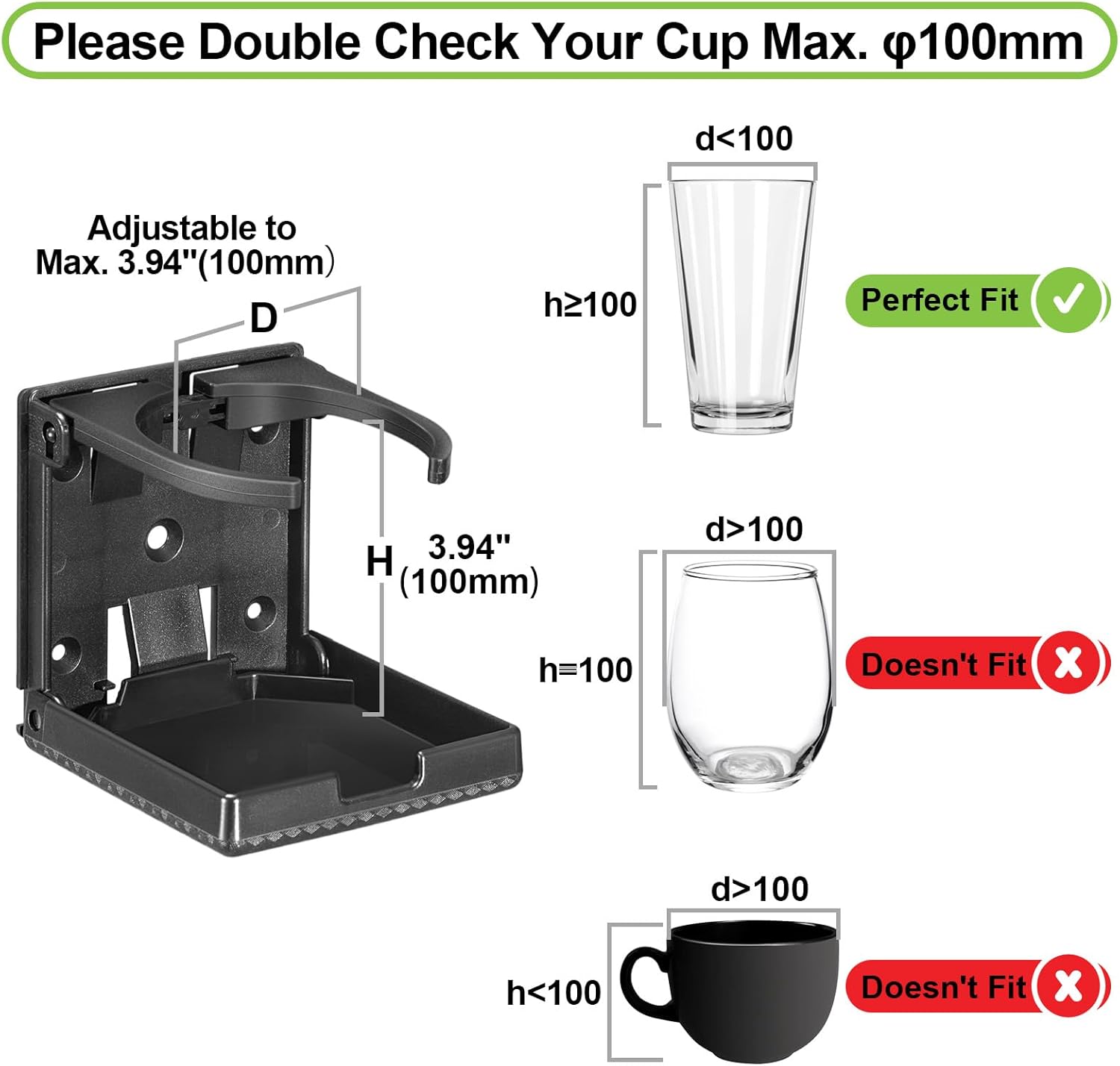 접이식 컵 홀더 레인지 – 다양한 크기의 음료 (컵, 캔, 병, 안경 등)를 유지하도록 설계된 조정 가능한 리테이너 암. 직경이 3-15/16 인치 (100mm) (2PCS 자동차 컵 홀더 포함 하드웨어 포함)