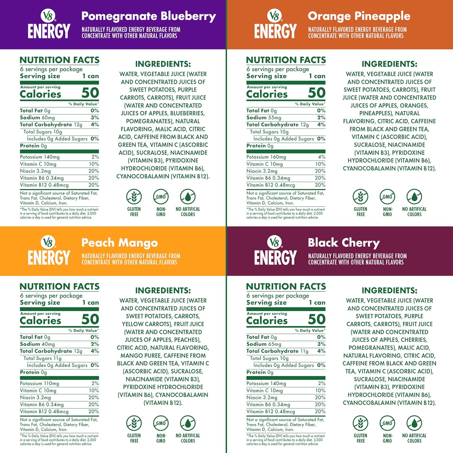 V8 +Energy Peach Mango, Orange Pineapple, Black Cherry 및 Pomegranate Blueberry Juice Energy Drinks의 6 개 (6) 8 fl oz 캔이 포함 된 버라이어티 팩