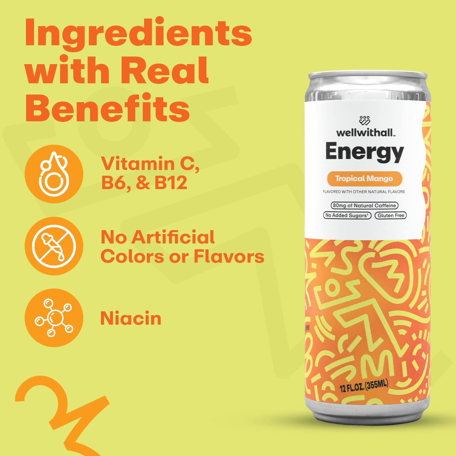 상쾌한 대안 – 45칼로리이고 설탕이 첨가되지 않은* WellWithAll은 차 기반 카페인으로 열대 망고에서 영감을 받은 리프트를 제공합니다. 이는 달콤한 탄산음료나 평소 커피 한 잔에서 벗어나 풍미 가득한 맛을 선사합니다. (*저칼로리 식품이 아닙니다. 자세한 내용은 영양 패널을 참조하세요.)