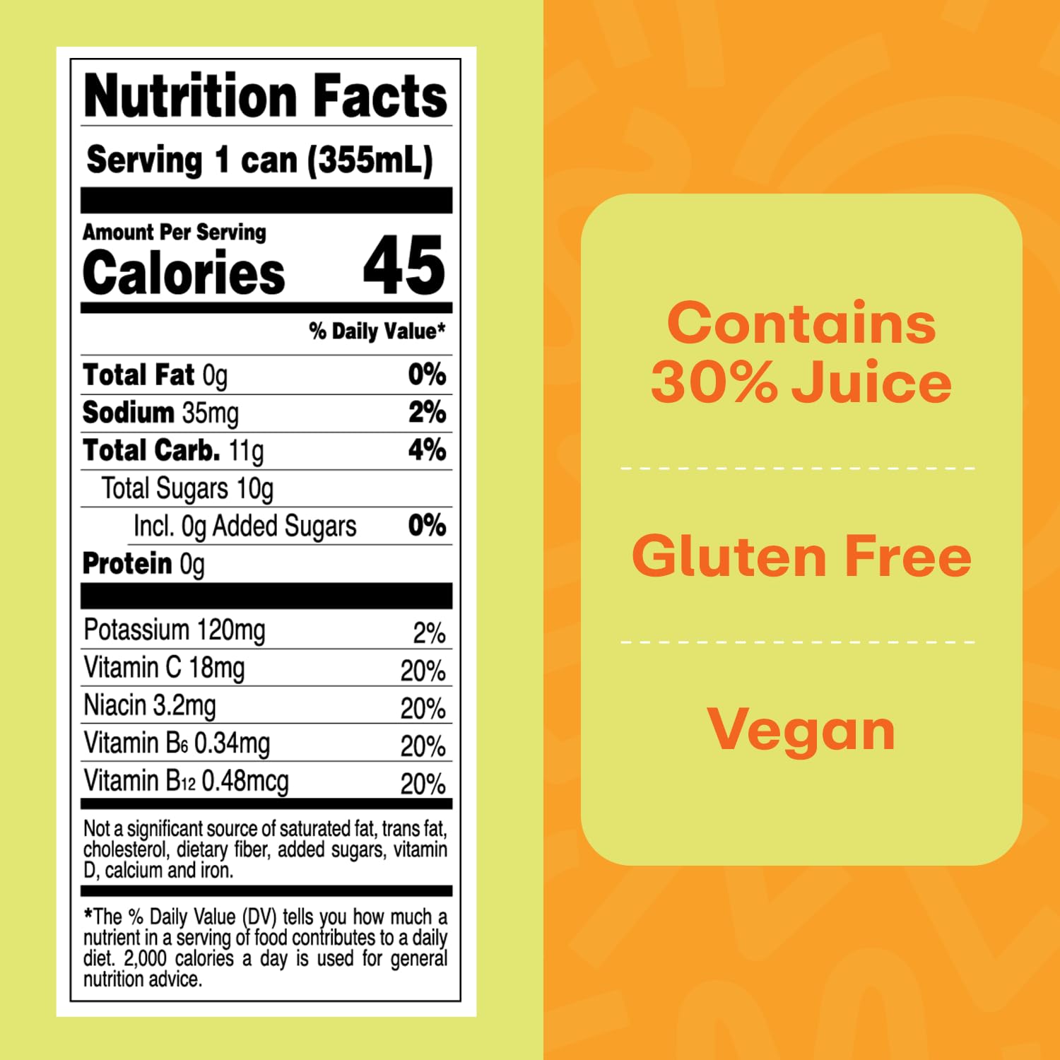 웰니스 중심 포뮬러 – 비타민 C와 주요 비타민 B가 함유되어 매일 에너지를 공급합니다. 인공 색소, 향료, 감미료(예: 수크랄로스, 아스파탐 또는 아세설팜 칼륨) 또는 설탕 알코올이 첨가되지 않았습니다. 이 완전 채식 및 글루텐 프리 음료는 매일 나타나는 방식을 지원합니다.